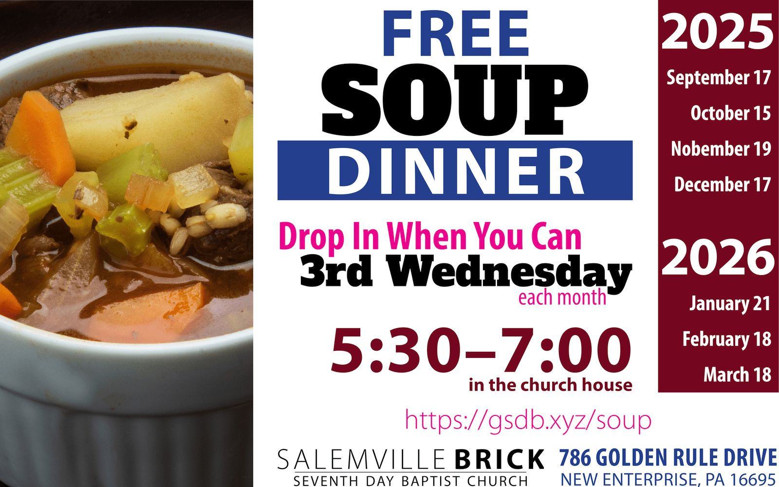 Next Soup Dinner: November 19, 20255:30 – 7:00 p.m. •Beef Vegetable• Gumbo& Chicken Noodle for the Kids Drop In When You Can Get Driving Directions